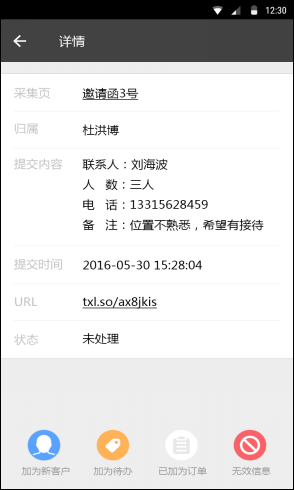 和CRM的紧密关联,让处理速度加快,销售同事在掌中宝app上,就可以把注册线索加入客户、加为待办或者加为订单。添加以后,可以在CRM中详细编辑其他字段和明细的内容。