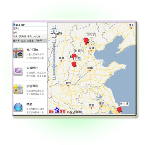 使用有定位功能的CRM,帮助外勤人员解决客户信息把握、行销决策制定、谈判技巧分析、合同回款事宜等。定位功能实现客户的位置和外勤人员是否到位的严格管理。