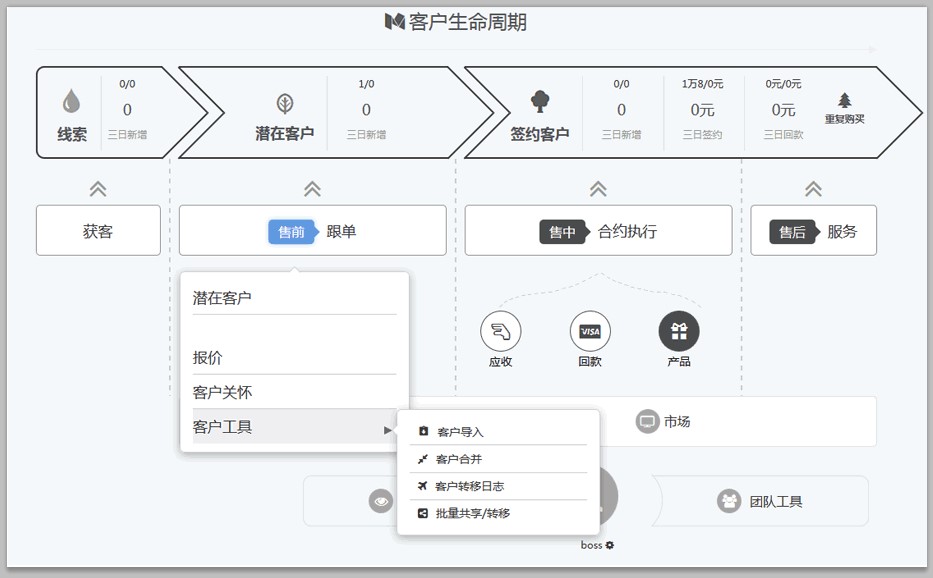 传统的客户生命周期是指一个客户对企业而言有类似生命一样的诞生、成长、成熟、衰老、死亡的过程。XTools CRM Plus版结合客户跟踪过程,重新定义了客户生命周期,将客户的生命周期划分为:线索获客,潜在客户跟进,售中签约,售后重复购买几个阶段。