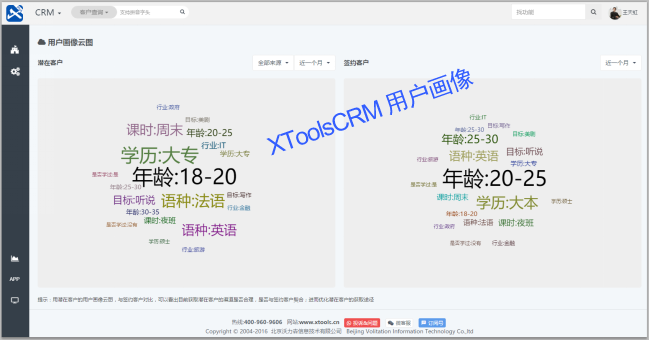 当你锁定了目标客户,并获得用户的基本信息之后,也就正式进入了销售员的跟单进程,推荐使用XTools CRM为用户贴“标签”,建立用户画像。XTools CRM软件的核心是客户关系管理,使用它建立用户画像不仅仅是方便快捷,另有独特之处。因为它可以自动形成潜在客户和签约客户云图,如果你不能确定自己目前锁定的客户是否为精准用户,就可以使用客户云图判断,对比两个云图,可以明显看出成功签约的客户所具备的标签,也就是真正有效的目标客户具备的共性。以大数据为依托的云图更具科学性,对比潜在客户的标签:一来可以快速转换跟单思路,提高在跟客户的签约转化率,二来就是在后续进行更加精准的信息流投放,最大限度锁定目标群体。